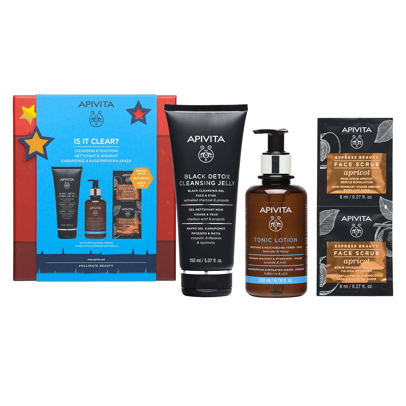 ΚΑΘΑΡΙΣΜΟΣ & ΚΑΤΑΠΡΑΫΝΤΙΚΗ ΔΡΑΣΗ: Μαύρο Gel Καθαρισμού, Καταπραϋντική & Ενυδατική Λοσιόν & Express Scrub Προσώπου βερύκοκο at a special price.